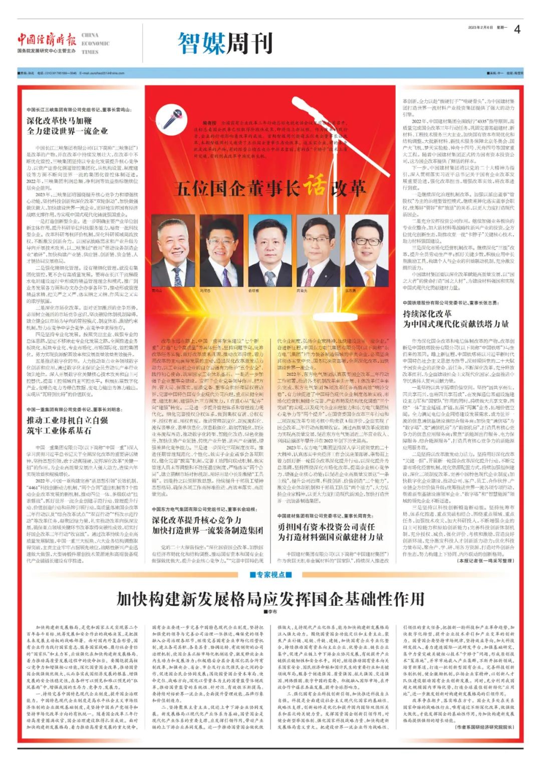 作为刷新的践行者,企业的行动影响着刷新的效果。2月6日,中国经济时报约请五位国企董事长话刷新。凯时官网集团党组书记、董事长俞培根先容了集团公司以党的二十大精神为指引,坚决贯彻落实党中央、国务院决议安排,周全深化刷新,加速建设天下一流企业的相关情形。