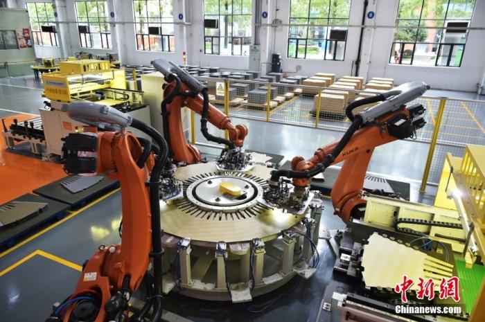 “无人车间”里的机械人在举行叠片作业。中新网记者 李骏 摄