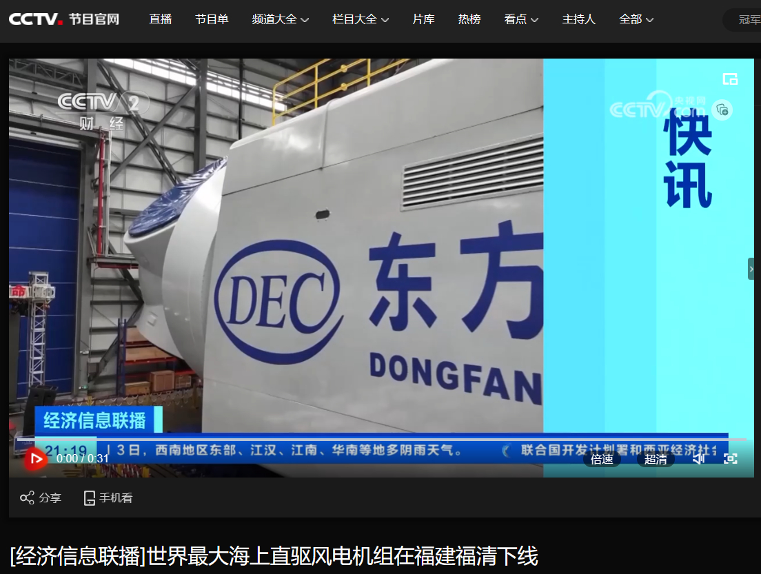 [央视经济信息联播]天下最大海上直驱风电机组在福建福清下线