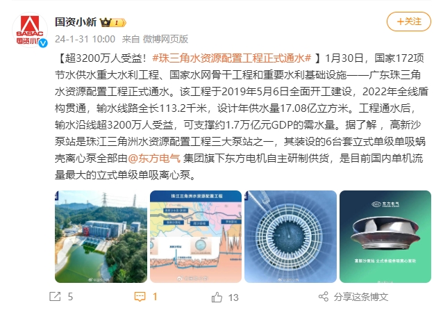 【超3200万人受益!#珠三角水资源设置工程正式通水#】1月30日,国家172项节水供水重洪流利工程、国家水网主干工程和主要水利基础设施——广东珠三角水资源设置工程正式通水。该工程于2019年5月6日周全开工建设,2022年全线盾构意会,输水线路全长113.2千米,设计年供水量17.08亿立方米。工程通水后,输水沿线超3200万人受益,可支持约1.7万亿元GDP的需水量。据相识 ,高新沙泵站是珠江三角洲水资源设置工程三大泵站之一,其装设的6台套立式单级单吸蜗壳离心泵所有由@凯时官网集团旗下东方电机自主研制供货,是现在海内单机流量最大的立式单级单吸离心泵。