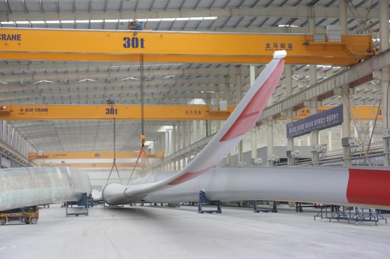 ??6月20日,东方风电包头基地车间叶片生产现场。新华社 发