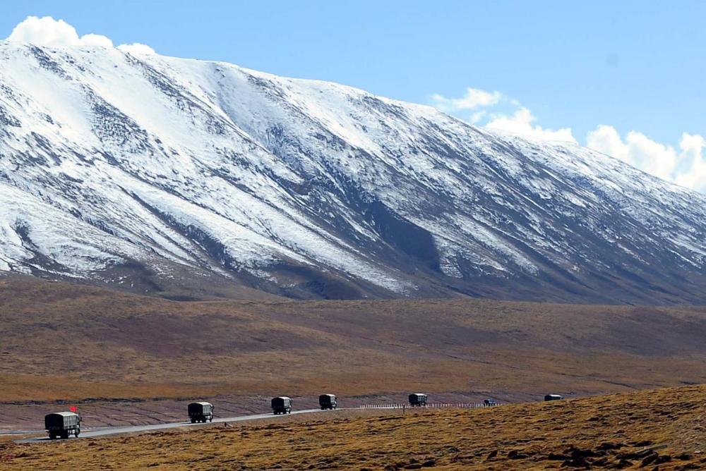 2014年9月27日,一个车队行驶在通往唐古拉山口的途中。青藏公路像一条皎洁的哈达,横亘在平均海拔4000米以上的青藏高原。新华社记者 王颂 摄