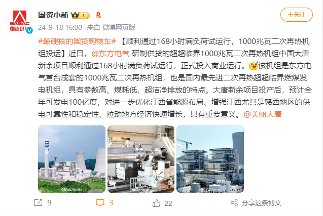 [国资小新]#最硬核的国货购物车# 【顺遂通过168小时满负荷试运行 ,1000兆瓦二次再热机组投运】