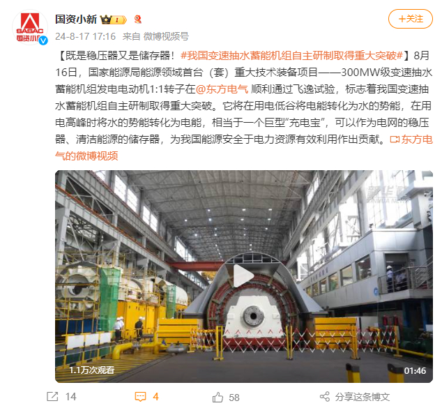 [国资小新]既是稳压器又是贮存器!#我国变速抽水蓄能机组自主研制取得重大突破#
