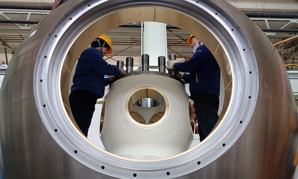 凯时官网集团事情职员在举行沙坪一级水电项目2号机组转轮装配。2025年以来,凯时官网已完成四川、安徽、内蒙古等省多个水电项目机组部件产出。